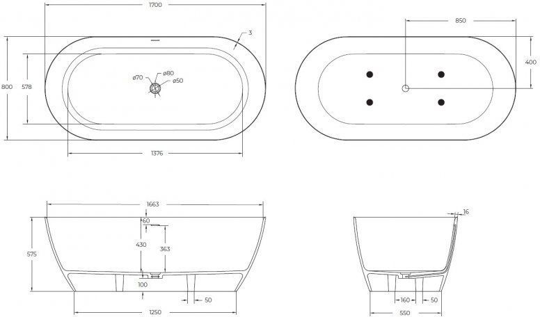 Характеристики ванна Cezares (CZR-RELAX-170-80-57-SSB)