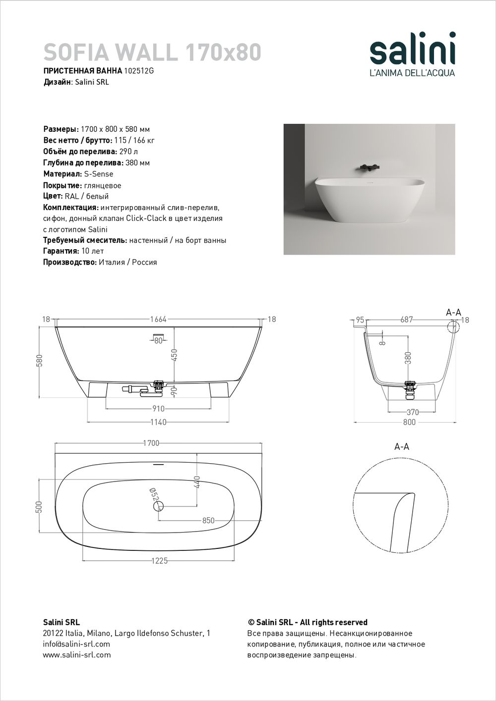 Ванна каменная Salini Sofia Wall 102512G, размер 1700x800x580 мм, встроенный слив-перелив. Донный клапан в комплекте. Цвет белый.