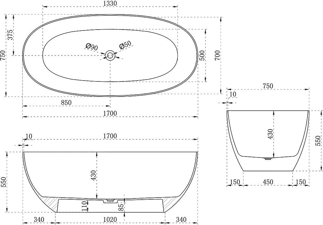 Ванна отдельностоящая CrystalMood Vincea 170x75 см VBT-6T01B, черный/прозрачный. В комплекте щелевой слив-перелив.
