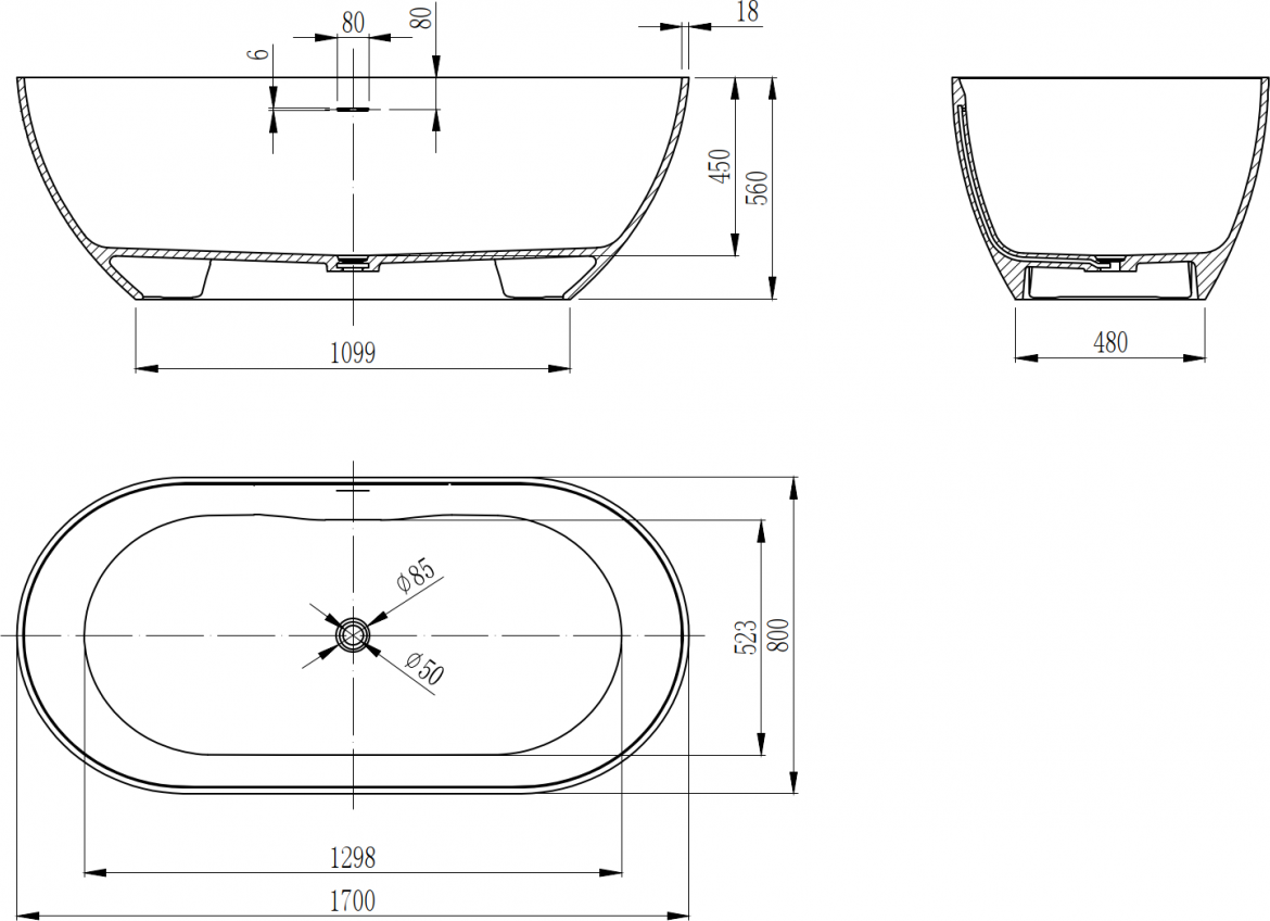 Ванна отдельностоящая Solid Surface Vincea 170x80 см VBT-4S04MW, белый матовый. В комплекте щелевой слив-перелив.
