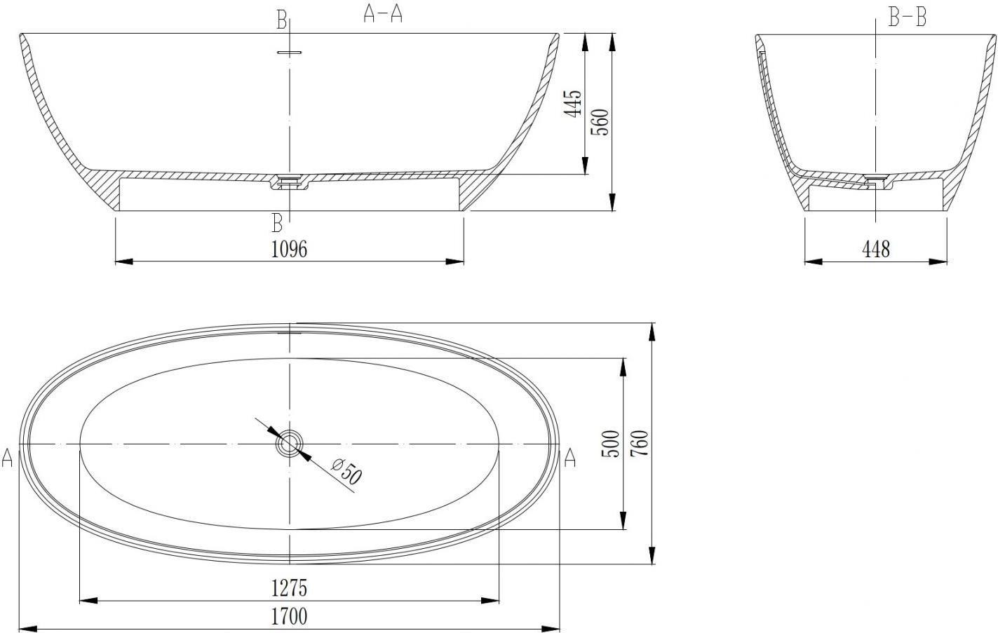 Ванна отдельностоящая Solid Surface Vincea 170x76 см VBT-4S01MW, белый матовый. В комплекте щелевой слив-перелив.