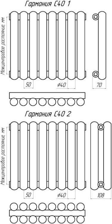 Радиаторы Гармония С конструктивно схожи с радиаторами Гармония А, но отличаются по дизайну. Радиаторы Гармония С имеют трубчатые колонки с торцами полусферической формы. Радиаторы Гармония С также как и Гармония А различаются по диаметру колонок (у Гармонии С25 - 25мм, у Гармонии С40 - 40 мм) и по шагу установки колонок на коллекторы.