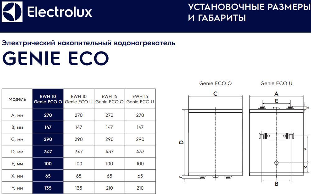 - Водонагреватели Electrolux серии EWH Genie ECO при своих скромных размерах отличаются высокой технологичностью и производительностью. Они идеальны для установки в малогабаритных помещениях и нишах, а благодаря возможности выбора моделей, как с нижним, так и с верхним подключением, прибор можно установить вне зависимости от места подвода воды.