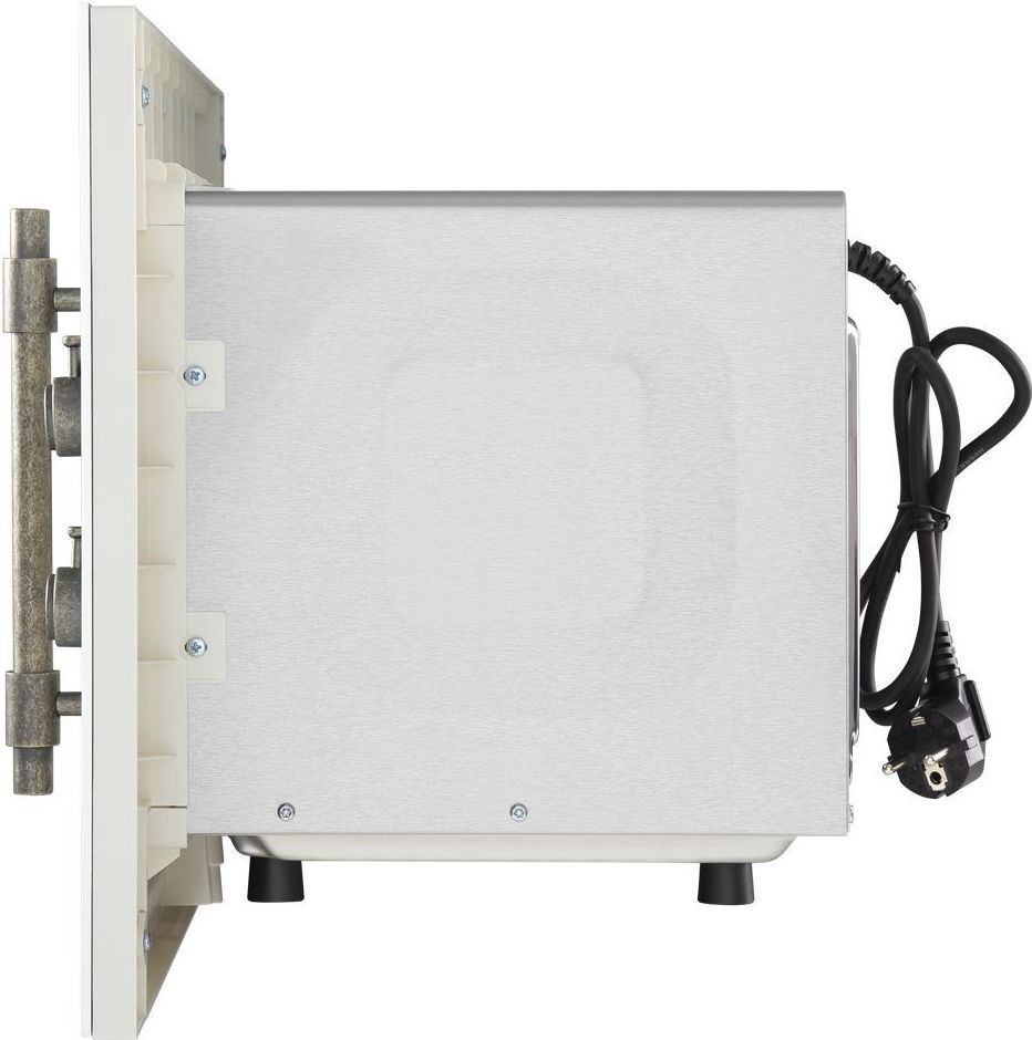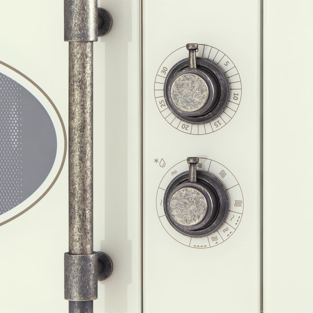 - Особенности: без поворотного стола, фасад из прочного стекла, гриль, открытие дверцы в любом режиме, подсветка камеры, дверца навесная, механический таймер, звуковой сигнал, бронзовые цельнометаллические ручки управления.