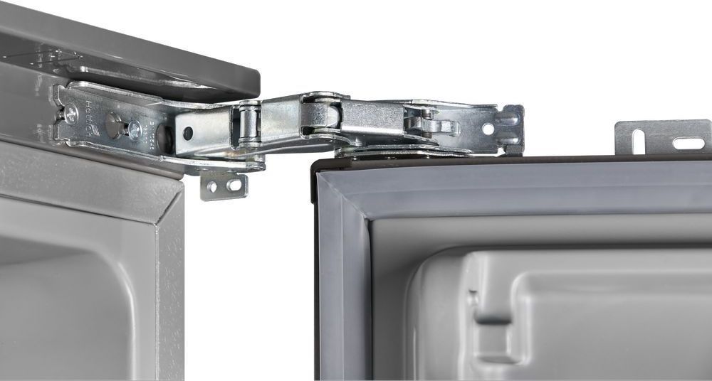- Модель имеет жесткую систему крепления фасадов с фиксированными оригинальными петлями Hettich. При таком монтаже фасады совершенно не связаны с корпусом холодильника. Конструкция имеет высокую жесткость, не ограничена углом открывания и не имеет зазоров, в которых может скапливаться пыль и грязь.