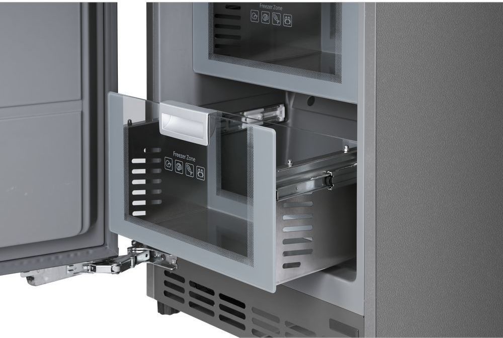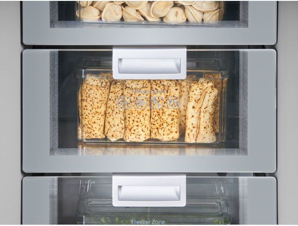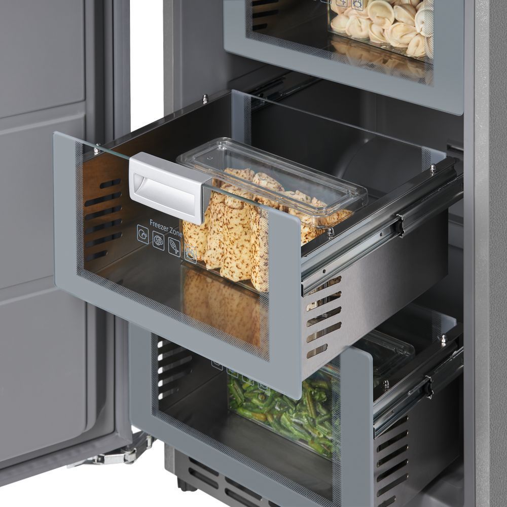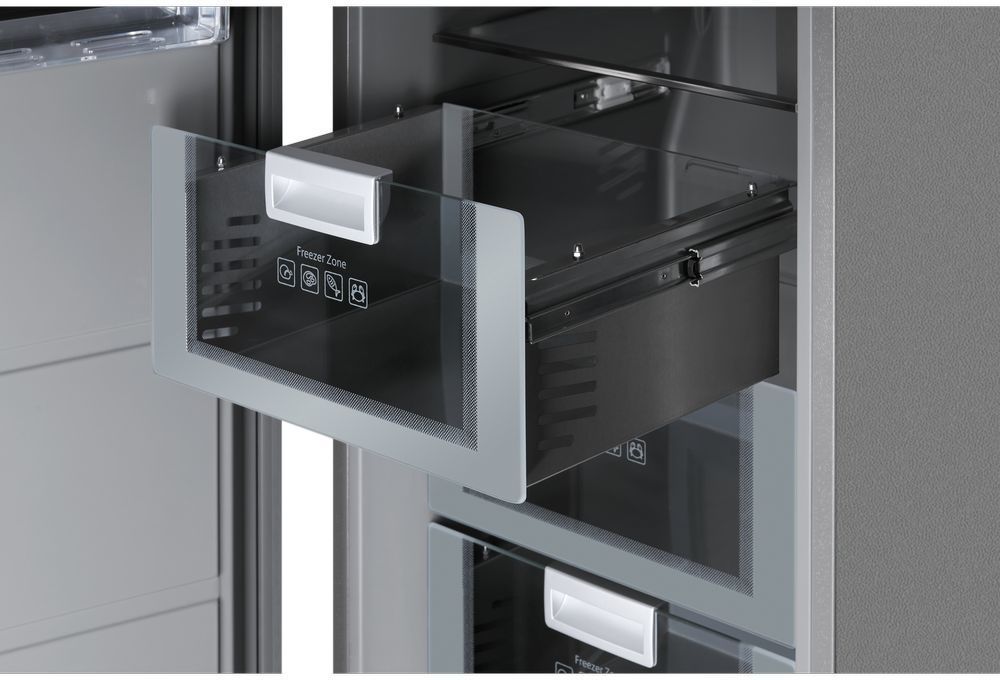 - Морозильник создан для тех, кто привык уделять внимание дизайну и стилю. Внутренняя отделка модели выполнена в серых тонах. Стеклянные полки, ящики из нержавеющей стали и стекла и другие составляющие подарят эстетическое удовольствие и удобство хранения продуктов.