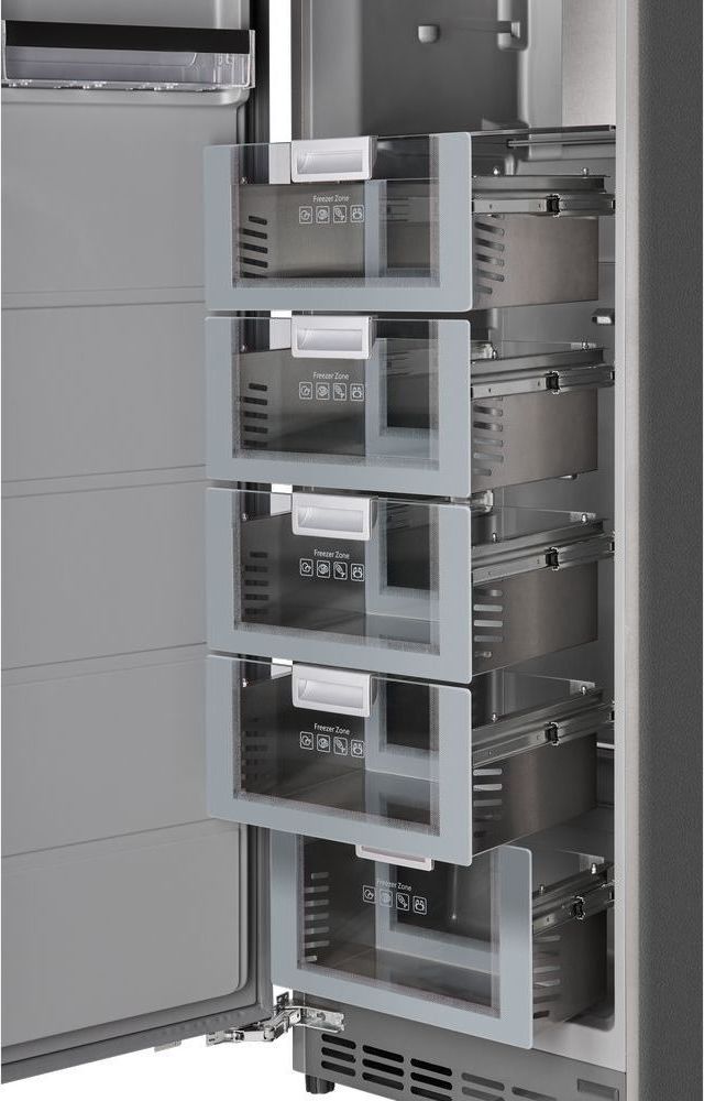 - 5 выдвижных ящиков из нержавеющей стали и стекла. Для плавного и мягкого открывания ящики выдвигаются на металлических направляющих. Нижний ящик увеличенного объема подходит для заморозки больших кусков мяса, птицы, морской рыбы. Полезный объем выдвижных ящиков — 125 литров