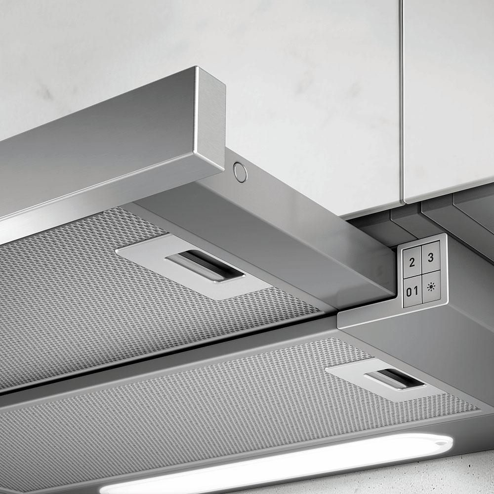 - Прибор включается путем выдвижения передней панели. Простые кнопочные переключатели гарантируют удобное управление тремя скоростями вытяжки и включением/выключением освещения. Алюминиевый фильтр пригоден для мытья в посудомоечной машине. Модель может работать в режимах отвода и рециркуляции. Две яркие светодиодные лампы станут полноценным источником освещения рабочей поверхности.