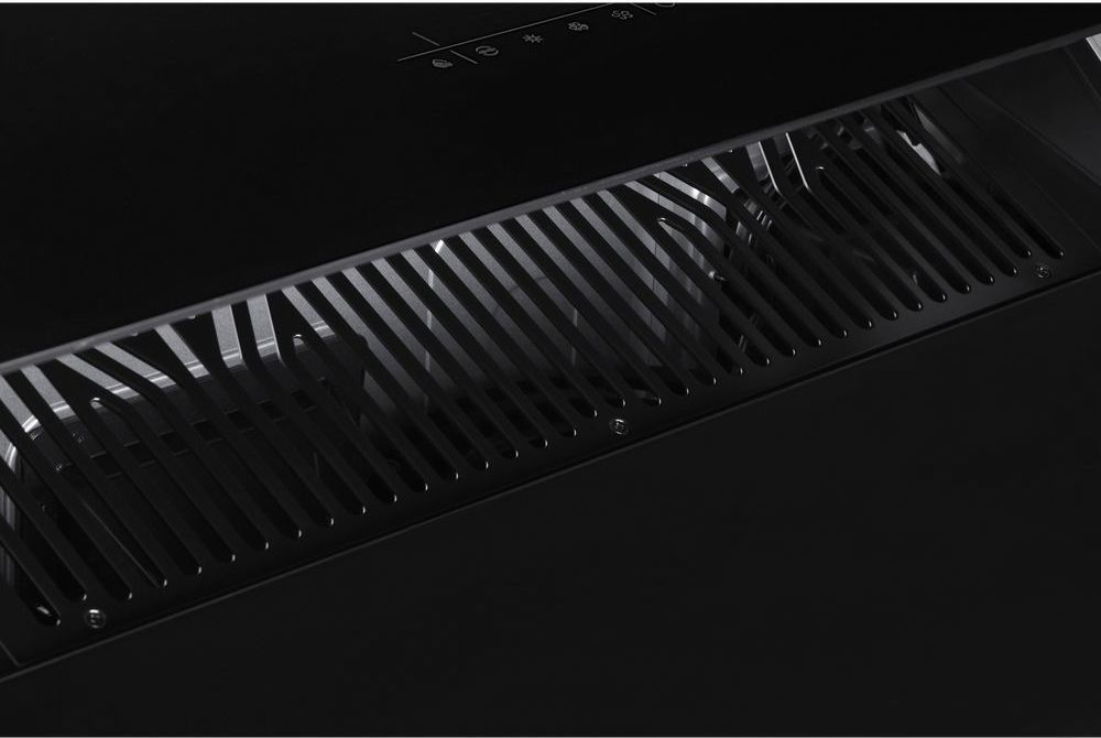 - Конструкция вытяжки создает дополнительное пространство для свободы движений. Модель черного цвета с фасадом из закаленного стекла станет стильным дополнением интерьера вашей кухни. Глянцевое стеклянное покрытие вытяжки легкое в уходе и имеет долгий срок службы.