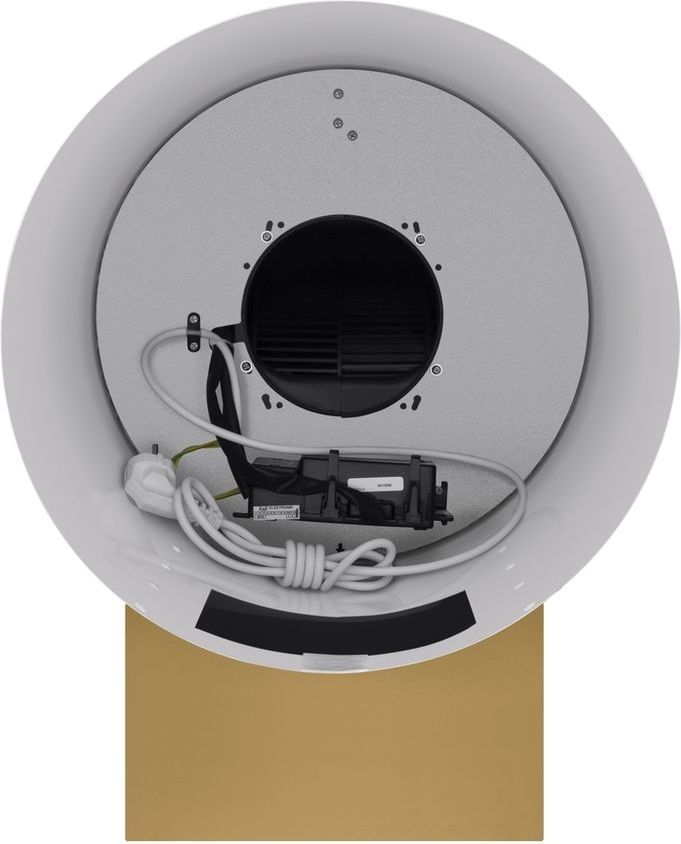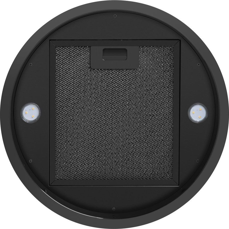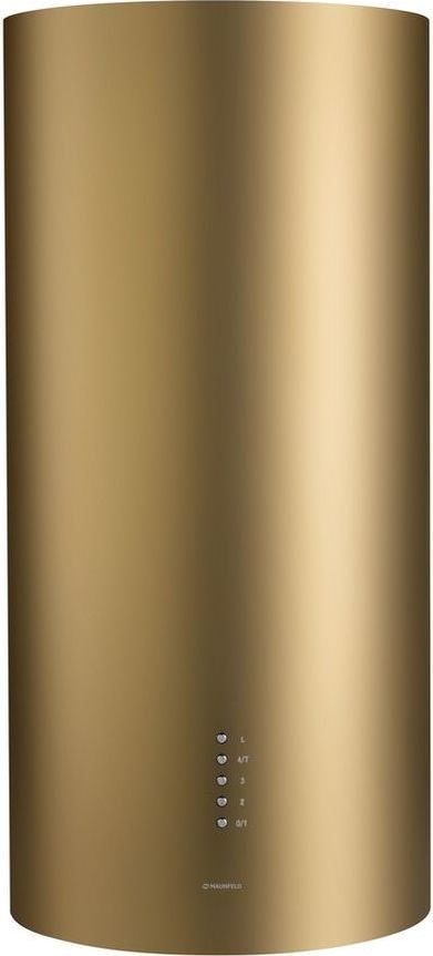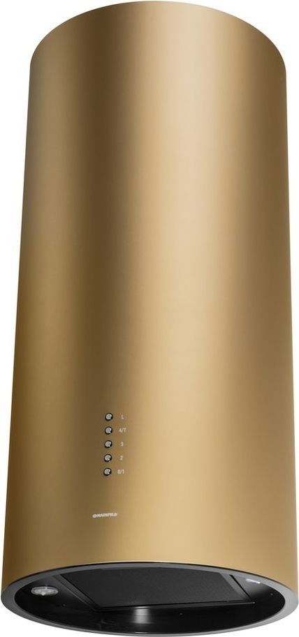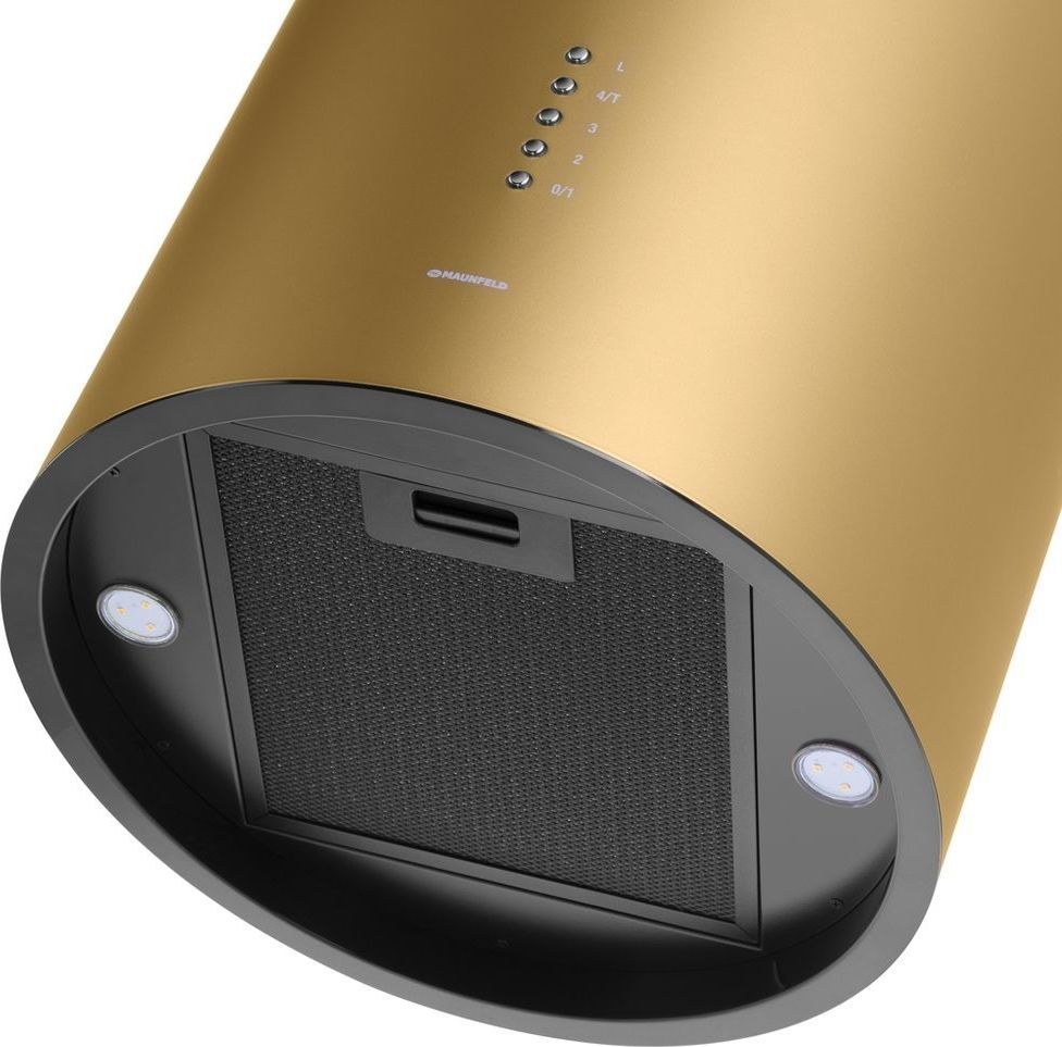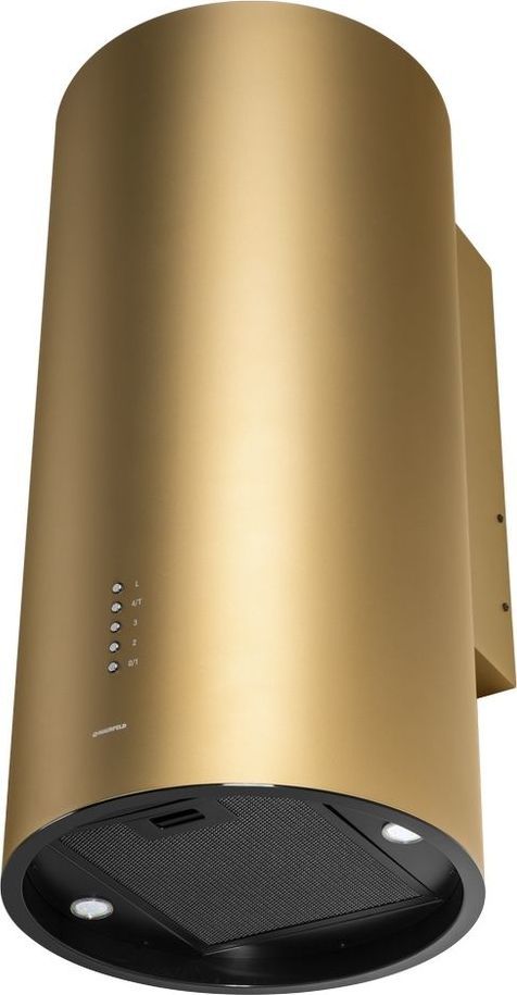 - Корпус цилиндрической формы, сделанный из нержавеющей стали с термостойким покрытием цвета матового золота, монтируется на стену над варочной поверхностью. Нижний торец вытяжки выполнен в черном акцентном цвете. Специальный многослойный жироулавливающий фильтр легко снимается и полностью разбирается, что сильно упрощает его чистку.