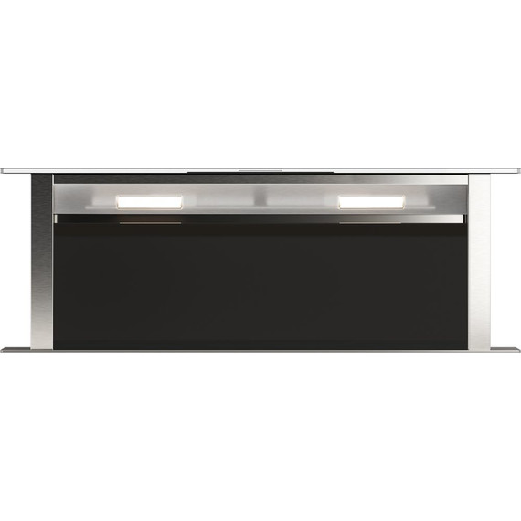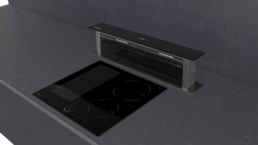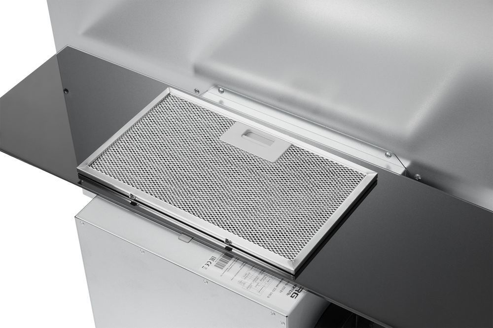 - Благодаря нисходящему потоку воздуха, вытяжка с мощностью двигателя 250 Вт и производительностью 1000 м³/ч позволяет быстро очистить воздух от запахов во время процесса приготовления пищи, а алюминиевый жироулавливающий фильтр предотвращает попадание жира и других загрязнений на детали двигателя.