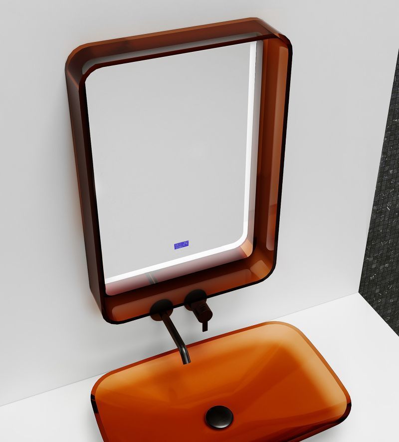 Зеркало Abber Kristall 55 см AT6701Opal с подсветкой, Bluetooth-плеером, датчиком температуры, часами и сенсорным выключателем, прозрачная рама из полиэфирной смолы, цвет красный.