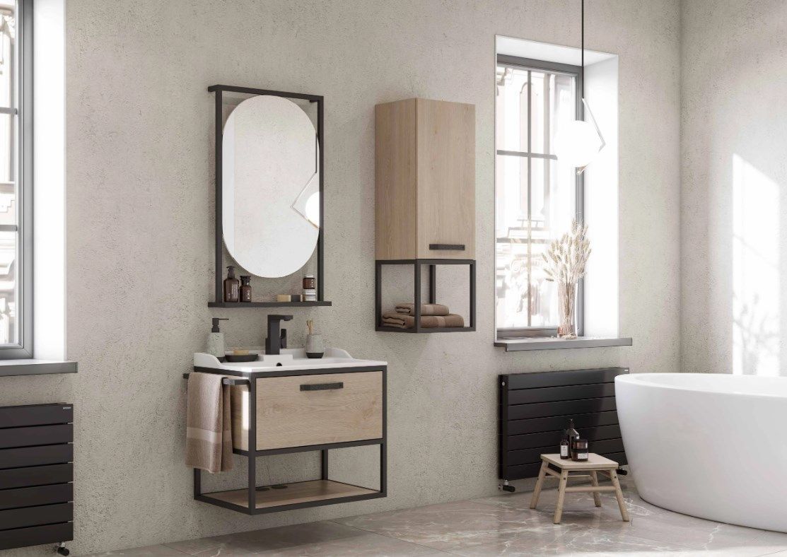 Зеркало Акватон Лофт Фабрик 50 см 1A242502LTDU0, черные металлические профили в форме прямоугольника обрамляют овальное зеркало, под которым находится полочка, цвет - дуб эндгрейн.