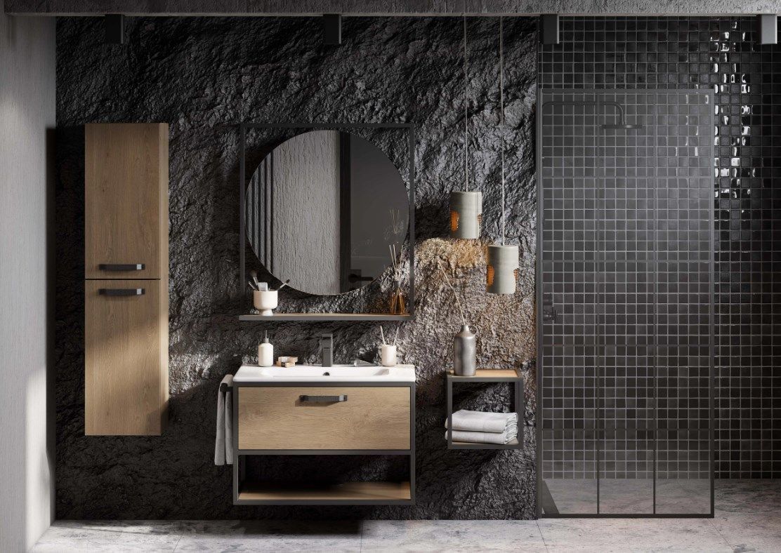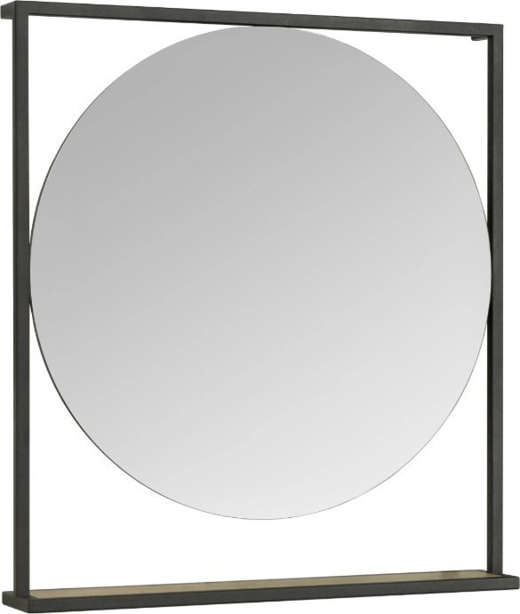 Зеркало Акватон Лофт Фабрик 80 см 1A242602LTDY0, черные металлические профили в форме прямоугольника обрамляют круглое зеркало, под которым находится полочка, цвет - дуб кантри.