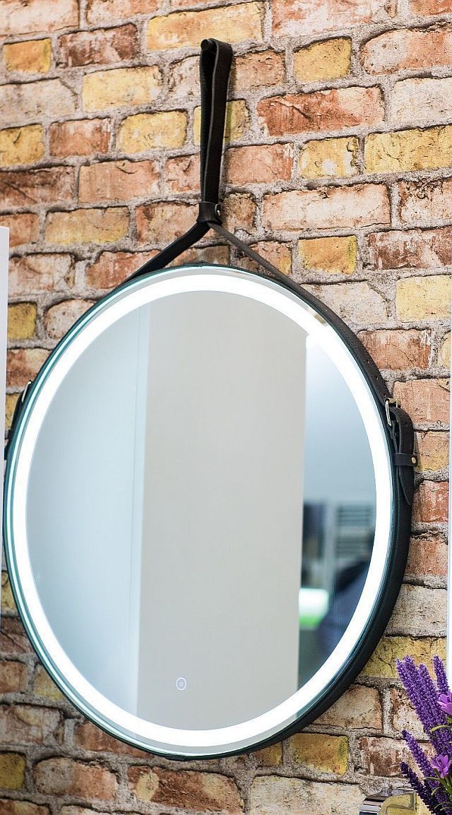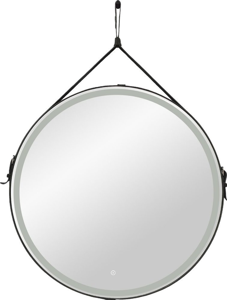 Зеркало Art&Max Milan Led 65 см AM-Mil-650-DS-F-Nero с подсветкой, диммером и сенсорным выключателем, ремень из натуральной кожи черного цвета.