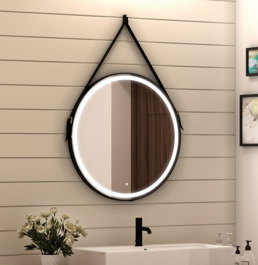 Зеркало Art&Max Milan Led 80 см AM-Mil-800-DS-F-Nero с подсветкой, диммером и сенсорным выключателем, ремень из натуральной кожи черного цвета.