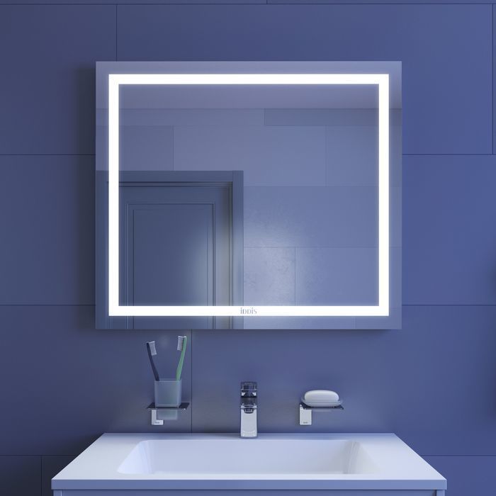 - На зеркальной поверхности не остается отпечатков пальцев благодаря механическому управлению светодиодной подсветкой. Выключатель спрятан на торце зеркала и невидим взгляду – активировать освещение можно простым нажатием на кнопку.