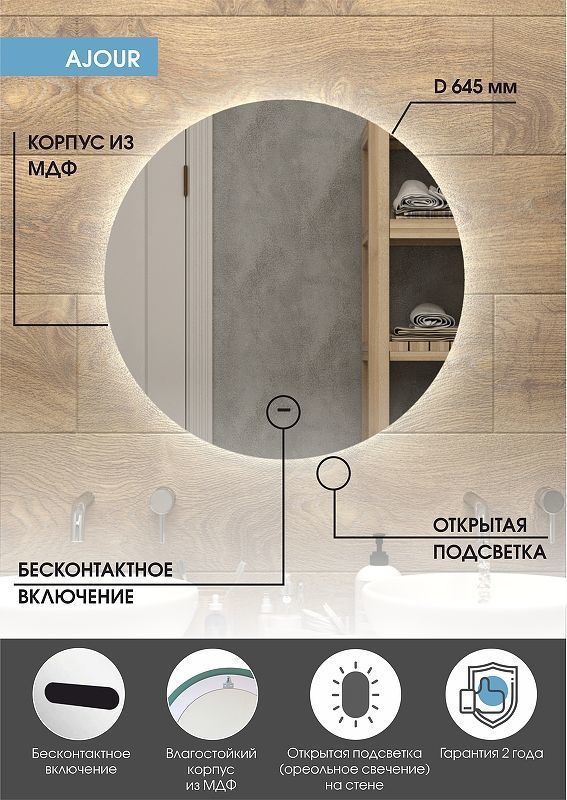 Зеркало с подсветкой "Ajour" D 645 бесконтактное, холодная подсветка - это настенное зеркало нового поколения, изготовленное из полотна толщиной 4 мм от ведущего европейского производителя AGC. При изготовлении используется светодиодная лента с плотностью диодов 120 шт/м и мощностью 9,6 Вт/м, обеспечивающая яркое и равномерное свечение. "Ajour" D 645 бесконтактное, холодная подсветка - это круглое зеркало для ванной шириной 64,5 см, высотой 64,5 см. Вес зеркала с упаковкой - 7 кг. Управление подсветкой бесконтактное. Температура ореольной подсветки холодная - 6000К, потребляемая мощность 23 Вт. Основа для изделия - корпус из ударопрочного пластика белого цвета.