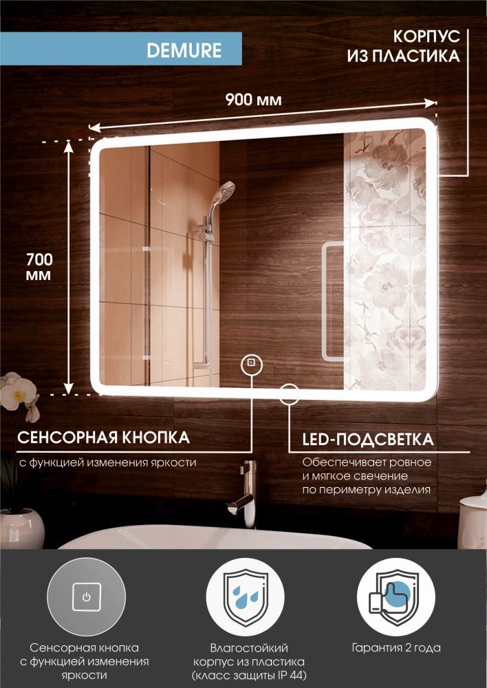 Зеркало Континент Demure Led 90 см ЗЛП502, подсветка 6000К, сенсорный выключатель с функцией диммирования.