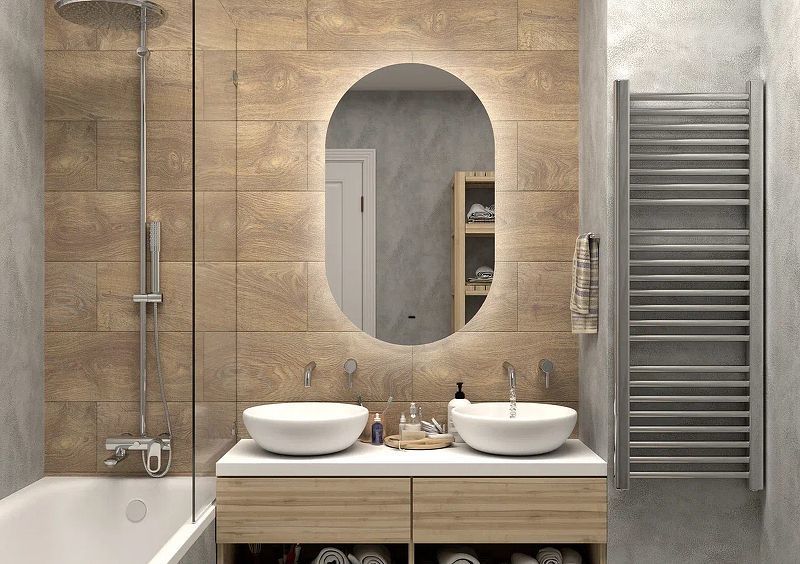 В качестве элемента LED-подсветки используется светодиодная лента с плотностью диодов 120 шт./м мощностью 9,6Вт/м. Это создает мягкое и равномерное свечение по периметру всего зеркала. Электрические компоненты размещены внутри корпуса, край полотна обработан еврокромкой, что обеспечивает надежную защиту от случайных порезов при контакте с изделием. Управление подсветкой осуществляется при помощи бесконтактного сенсора.