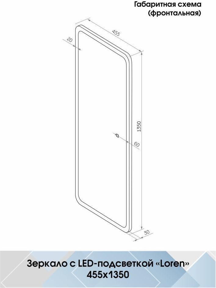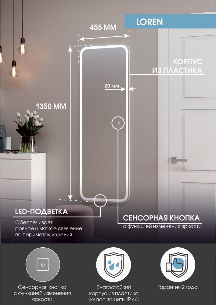 Зеркало "Loren Led" 455х1350 изготовлено из зеркального полотна толщиной 4 мм производства ведущего европейского производителя зеркал AGC.В качестве элемента LED-подсветки используется светодиодная лента с плотностью диодов 120 шт./м мощностью 9,6Вт/м. Это создает мягкое и равномерное свечение по периметру всего зеркала. Электрические компоненты размещены внутри корпуса, край полотна обработан еврокромкой, что обеспечивает надежную защиту от случайных порезов при контакте с изделием. Управление подсветкой осуществляется при помощи сенсорной кнопки, вынесенной на лицевую панель для удобства настройки необходимой яркости. Зеркало поставляется в комплекте с настенным крепежом. Данное зеркало предназначено для вертикального размещения. Изделие прошло обязательную сертификацию и может использоваться в помещениях с повышенной влажностью воздуха. Срок гарантии - 2 года.
