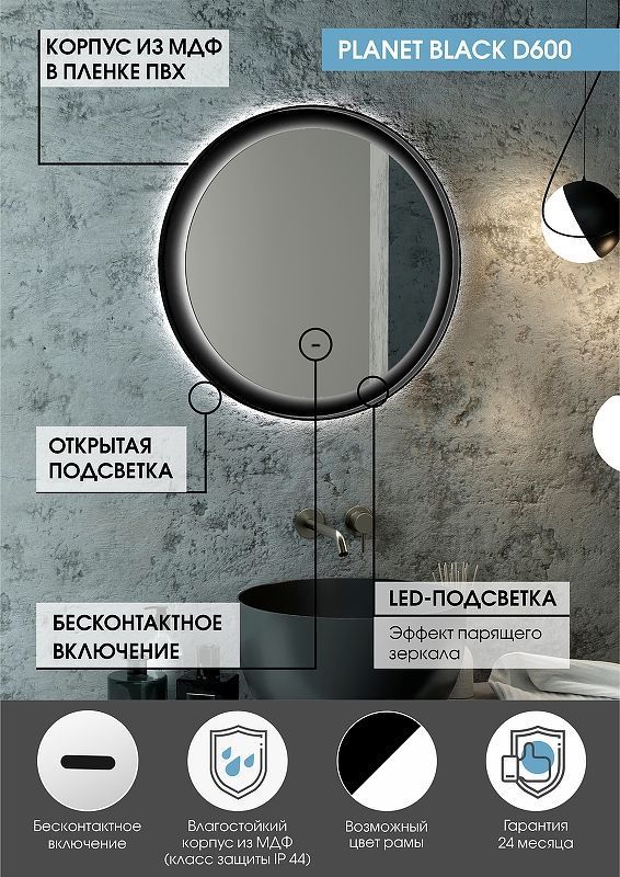 Зеркало Континент Planet Black Led 60 см ЗЛП623, подсветка 6000К, бесконтактный сенсор с функцией диммирования, рама - МДФ короб в черной пленке Soft touch.