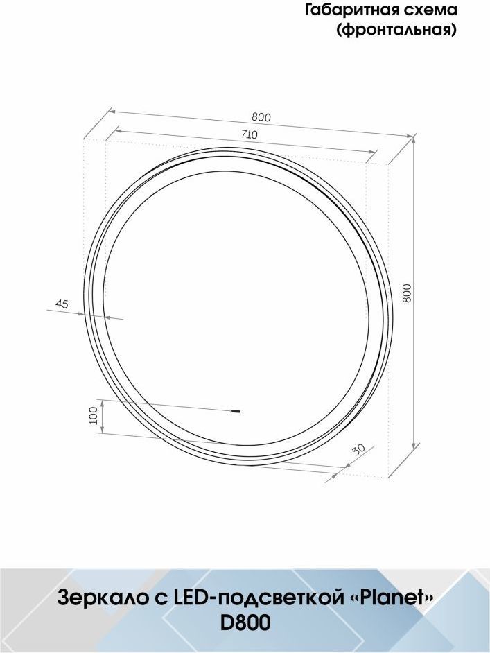 Зеркало "Planet" D800 изготовлено из зеркального полотна толщиной 4 мм производства ведущего европейского производителя зеркал AGC. Модель отличается стильным минималистическим дизайном. В качестве элемента LED-подсветки используется светодиодная лента с плотностью диодов 120 шт./м мощностью 9,6Вт/м. Это создает мягкое и равномерное свечение по периметру всего зеркала. Электрические компоненты размещены внутри корпуса, край полотна обработан еврокромкой, что обеспечивает надежную защиту от случайных порезов при контакте с изделием. Управление подсветкой осуществляется при помощи бесконтактного сенсора.