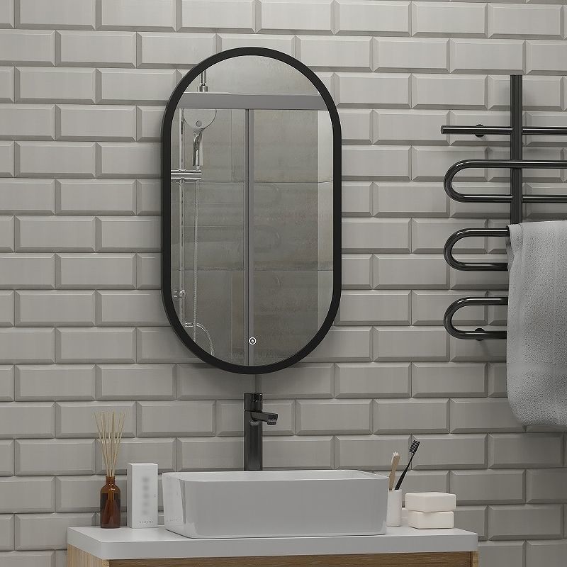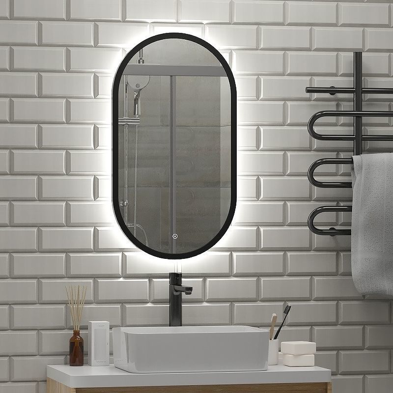 Зеркало Континент Prime Black Led 45 см ЗЛП2199, ореольная подсветка 6000К, сенсорный выключатель с функцией диммирования, рама МДФ черного цвета.