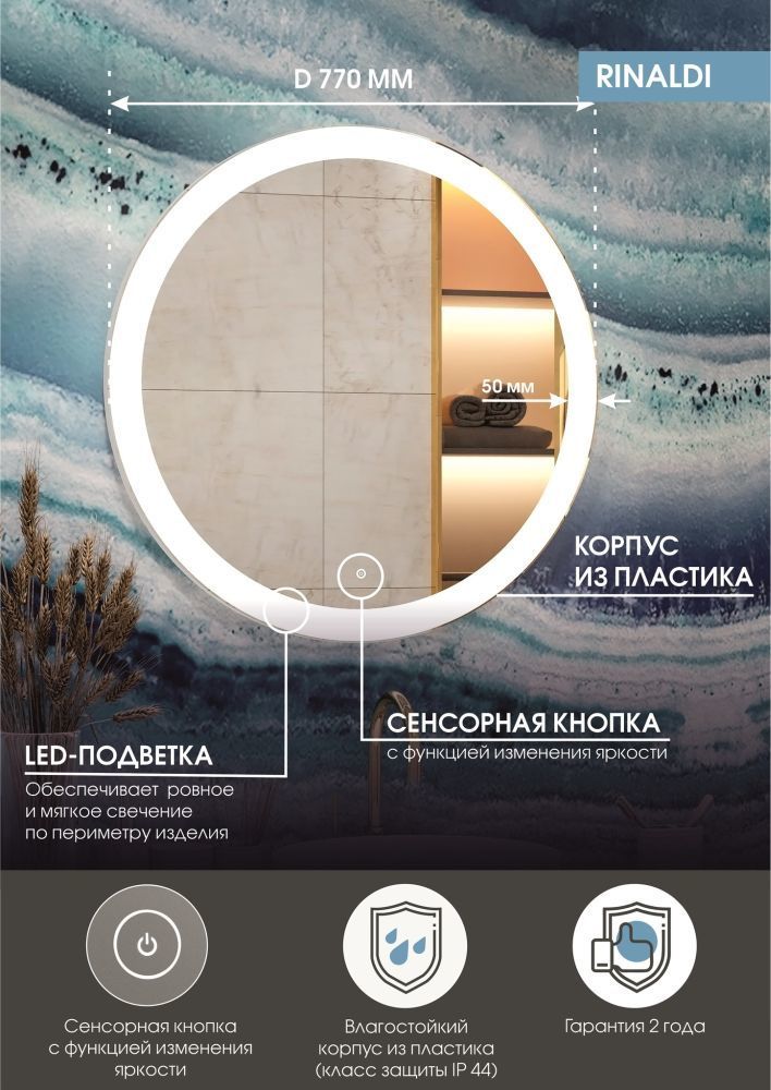 Зеркало Континент Rinaldi Led 77 см ЗЛП39, подсветка 6000К, сенсорный выключатель с функцией диммирования.