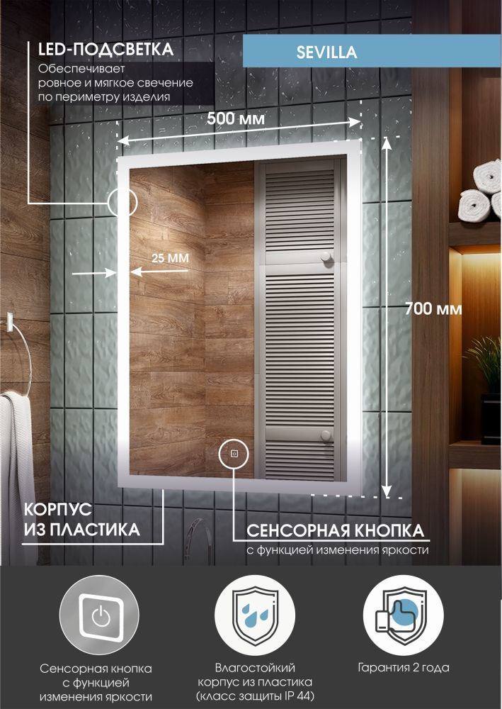 Зеркало Континент Sevilla Led 50 см ЗЛП524, подсветка 6000К, сенсорный выключатель с функцией диммирования.