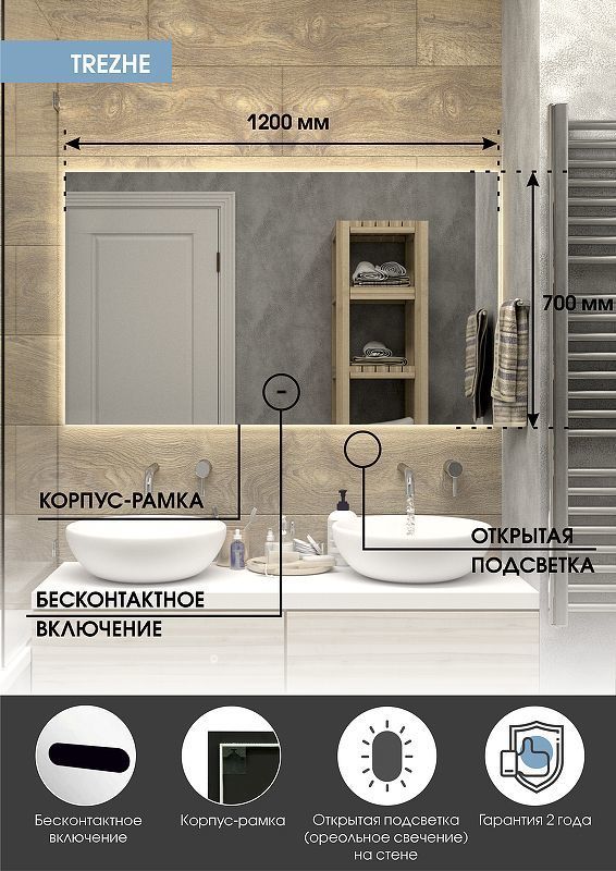 Зеркало с подсветкой Trezhe Led 1200x700 ЗЛП533 - это настенное зеркало нового поколения, изготовленное из полотна толщиной 4 мм от ведущего европейского производителя AGC. При изготовлении используется светодиодная лента с плотностью диодов 120 шт/м и мощностью 9,6 Вт/м, обеспечивающая яркое и равномерное свечение. Trezhe Led 1200х700 - это квадратное зеркало для ванной шириной 120 см, высотой 70 см. Управление подсветкой бесконтактное. Температура ореольной подсветки холодная - 6000К, потребляемая мощность 35 Вт. Основа для изделия - корпус из ПВХ рамка белого цвета.
