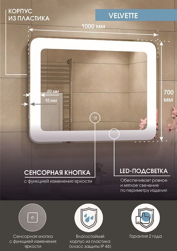 Зеркало с подсветкой Velvette Led 1000x700 - это настенное зеркало нового поколения, изготовленное из полотна толщиной 4 мм от ведущего европейского производителя AGC. При изготовлении используется светодиодная лента с плотностью диодов 120 шт/м и мощностью 9,6 Вт/м, обеспечивающая яркое и равномерное свечение. Velvette Led 1000x700 - это прямоугольное зеркало для ванной шириной 100 см, высотой 70 см. Для управления подсветкой используется cенсор. Температура внутренней подсветки холодная - 6000К, потребляемая мощность 31 Вт. Основа для изделия - корпус из ударопрочного пластика белого цвета.