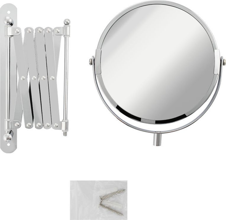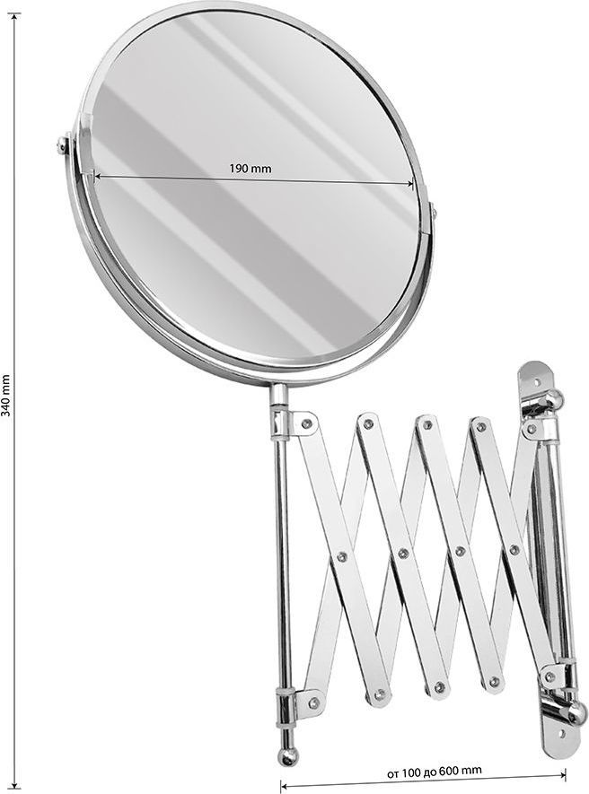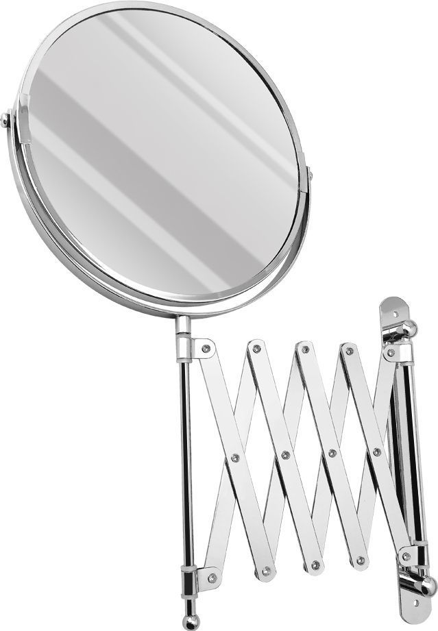 Зеркало настенное, косметическое, раздвижное, двустороннее, с увеличительным эффектом. Изготовлено из прочной нержавеющей стали с хромированным покрытием, которое придает безупречный стильный вид и долговечность. Хромированное покрытие очень стойко переносит истирания и обеспечивает зеркальный блеск изделия. Установлено на металлический хромированный держатель, позволяющий поворачиваться вокруг своей оси и регулировать угол наклона модели. Снабжено механизмом «гармошка», которое позволяет зеркалу выдвигаться на требуемое расстояние и компактно складываться. Одна из сторон зеркала имеет 3х-кратное увеличение удобное для косметических процедур, нанесения макияжа и бритья. Монтируется к стене при помощи крепления, входящего в комплект. Габаритные размеры: диаметр 190 мм. высота 340 мм, длина от 100 до 600 мм. Вес - 1,000 кг, объём - 0,00320 м3.