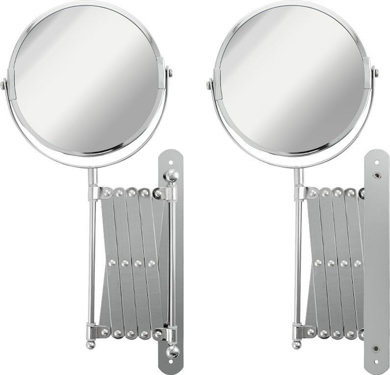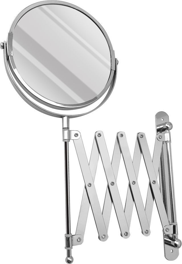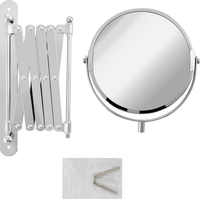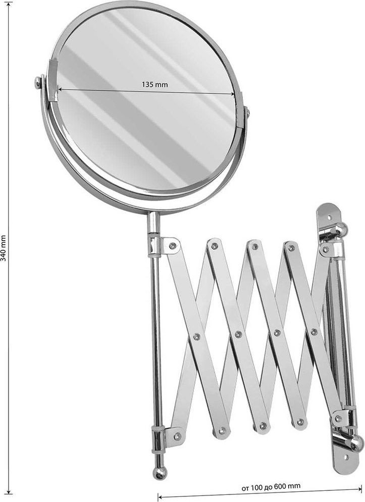 Зеркало настенное, косметическое, раздвижное, двустороннее, с увеличительным эффектом. Изготовлено из прочной нержавеющей стали с хромированным покрытием, которое придает безупречный стильный вид и долговечность. Хромированное покрытие очень стойко переносит истирания и обеспечивает зеркальный блеск изделия. Установлено на металлический хромированный держатель, позволяющий поворачиваться вокруг своей оси и регулировать угол наклона модели. Снабжено механизмом «гармошка», которое позволяет зеркалу выдвигаться на требуемое расстояние и компактно складываться. Одна из сторон зеркала имеет 3х-кратное увеличение удобное для косметических процедур, нанесения макияжа и бритья. Монтируется к стене при помощи крепления, входящего в комплект. Габаритные размеры: диаметр 135 мм, высота 340 мм, длина от 100 до 600 мм. Вес - 0,800 кг, объём - 0,00320 м3.