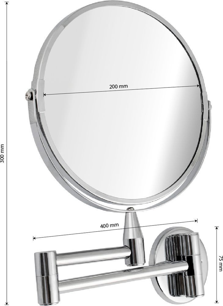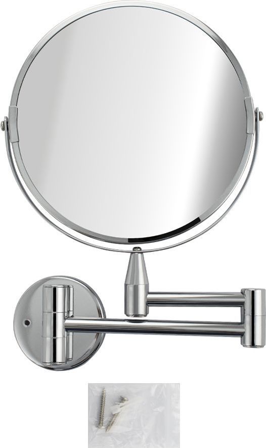 Зеркало настенное, косметическое, раздвижное, двустороннее, с увеличительным эффектом. Изготовлено из прочной нержавеющей стали с хромированным покрытием, которое придает безупречный стильный вид и долговечность. Хромированное покрытие очень стойко переносит истирания и обеспечивает зеркальный блеск изделия. Установлено на металлический хромированный держатель, позволяющий поворачиваться вокруг своей оси и регулировать угол наклона модели. Снабжено складным механизмом «коленце», которое позволяет зеркалу выдвигаться на требуемое расстояние и компактно складываться. Одна из сторон зеркала имеет 3х-кратное увеличение удобное для косметических процедур, нанесения макияжа и бритья. Монтируется к стене при помощи крепления, входящего в комплект. Габаритные размеры: диаметр 200 мм, высота 300 мм, общая длина 400 мм, диаметр пятака 75 мм. Вес - 0,700 кг, объём - 0,00320 м3.