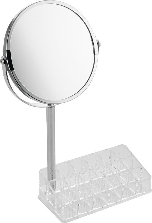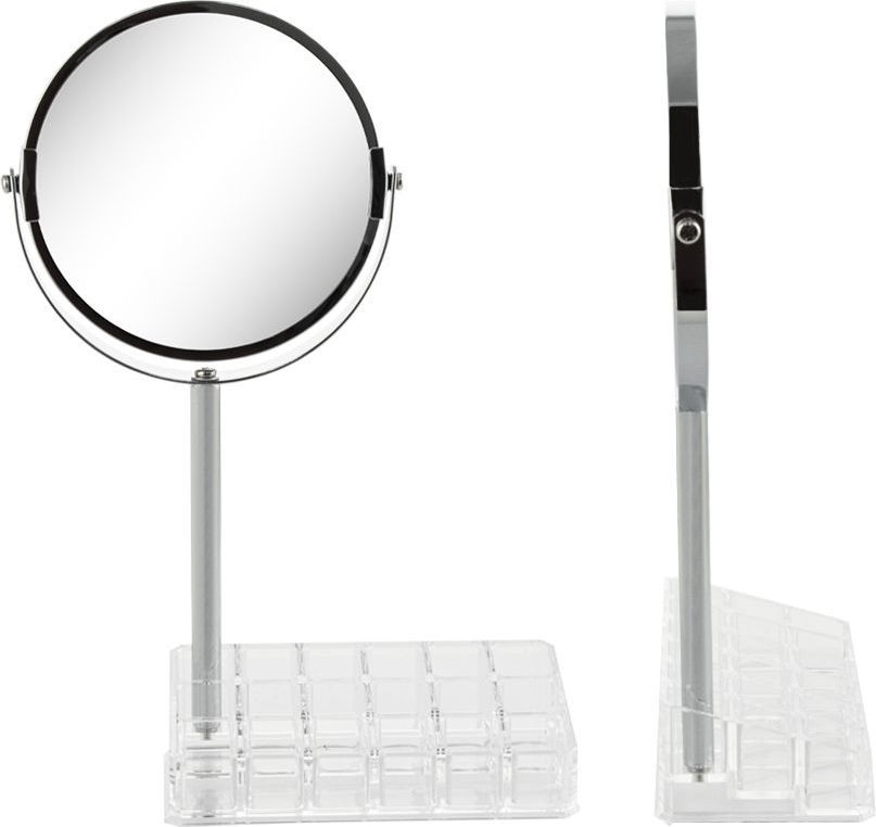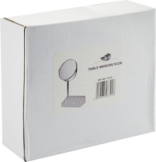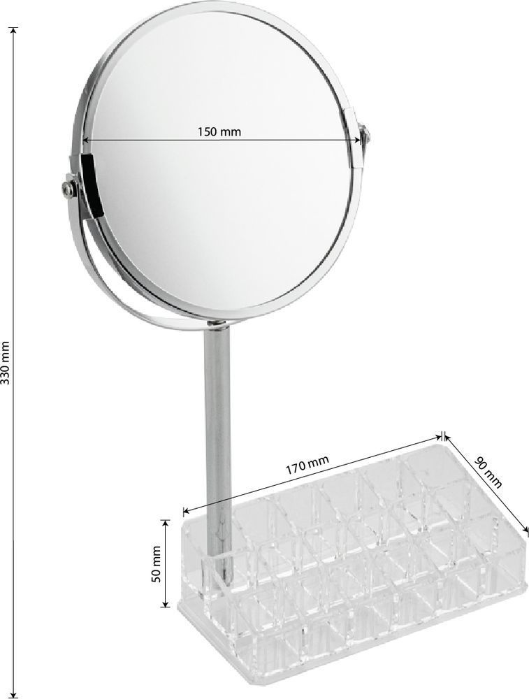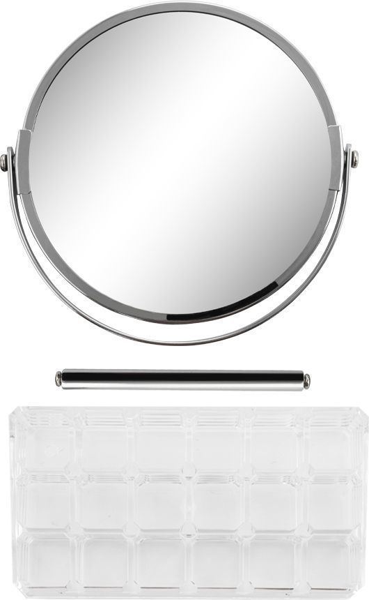 Зеркало настольное, косметическое, с подставкой для макияжных принадлежностей, двустороннее, с увеличительным эффектом. Изготовлено из прочной нержавеющей стали с хромированным покрытием, которое придает безупречный стильный вид и долговечность. Хромированное покрытие очень стойко переносит истирания и обеспечивает зеркальный блеск изделия. Установлено на металлический хромированный держатель, позволяющий поворачиваться вокруг своей оси и регулировать угол наклона модели. Одна из сторон зеркала имеет 2 х-кратное увеличение удобное для косметических процедур, нанесения макияжа и бритья. Устанавливается на любую поверхность. Габаритные размеры: диаметр 150 мм, высота 330 мм, высота подставки 50 мм, длина подставки 170 мм, глубина подтавки 90 мм. Вес - 0,600 кг, объём - 0,00227 м3.
