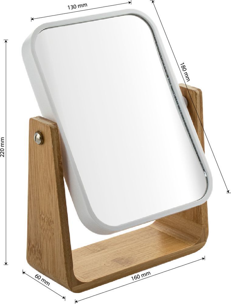 Зеркало настольное, косметическое, двустороннее, с увеличительным эффектом, основание из бамбука. Установлено на металлический держатель, позволяющий поворачиваться вокруг своей оси и регулировать угол наклона модели. Одна из сторон зеркала имеет 3х-кратное увеличение удобное для косметических процедур, нанесения макияжа и бритья. Устанавливается на любую поверхность. Габаритные размеры: высота 220 мм, зеркало 130 х 180 мм, низ бамбуковой подставки 160 х 60 мм. Вес - 0,500 кг, объём - 0,00224 м3.