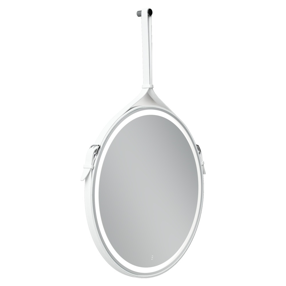 - Зеркало для ванной комнаты круглое с ремнем из натуральной кожи белого цвета