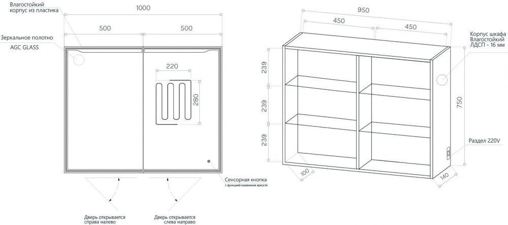 - Оснащение: зеркало-шкаф, провод с вилкой 1 м, розетка, навес, коробка, инструкция