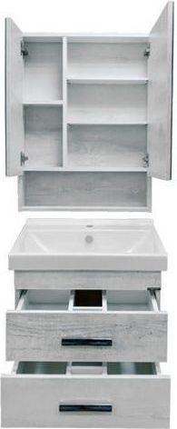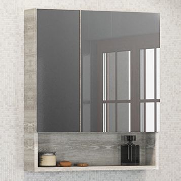 Зеркальное высококачественное полотно с амальгамой на основе серебра. Створки оснащены петлями с плавным закрыванием. Обе боковые створки зеркала открываются наружу. За широкой створкой две горизонтальные полки, за узкой одна. На нижней внешней полке можно расположить невысокие принадлежности для умывания.