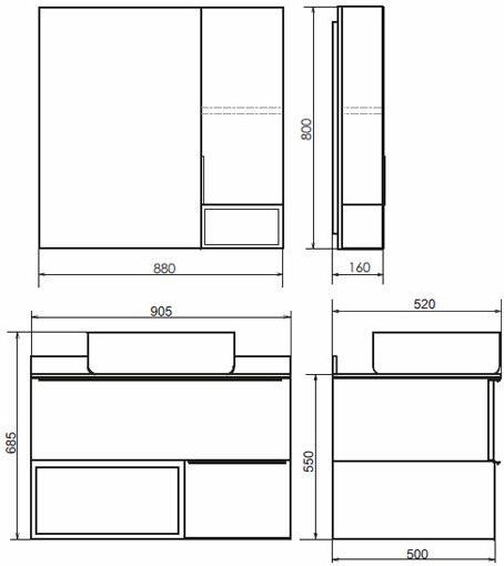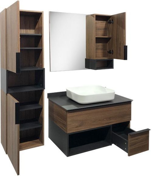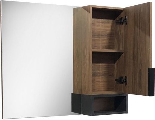Зеркальное высококачественное полотно с амальгамой на основе серебра. Створка мебельного элемента оснащена петлями с системой плавного закрывания. За дверцей одна горизонтальная полка. На мебельном элементе зеркала черная матовая алюминиевая ручка.