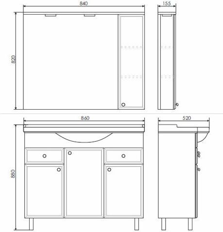 Зеркальное высококачественное полотно с амальгамой на основе серебра. Створка мебельного элемента оснащена петлями с системой плавного закрывания и покрыта белой глянцевой эмалью. В верхней полке два точечных светильника и выключатель.